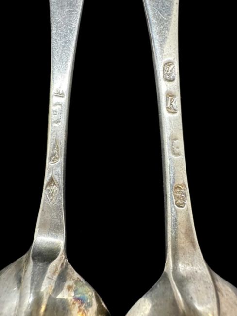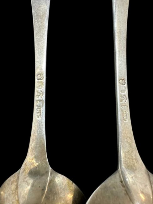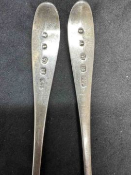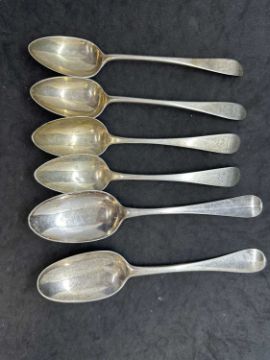 Flatware four dessert spoons and two serving spoons, mixed patterns and Scottish hallmarks. Total weight 8.25oz.