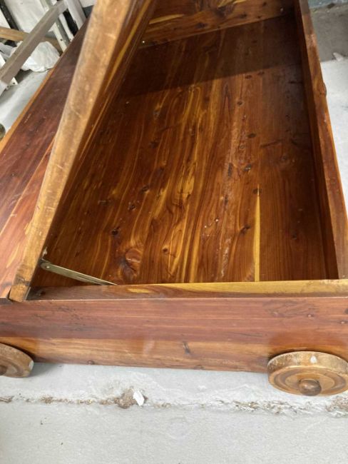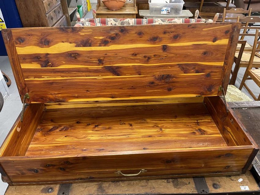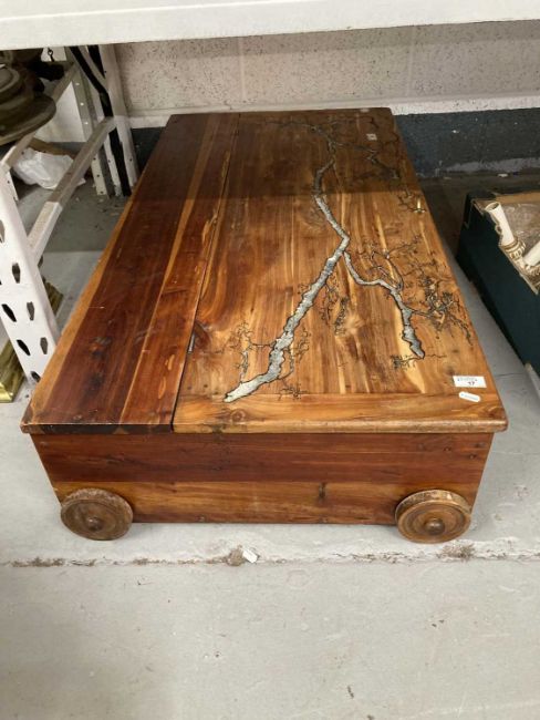 Red pine under-bed storage box decorated with acid-etched ancient pine tree designs. 46½ins. x 23½ins. x 9ins. (118cm x 60cm x 23cm)