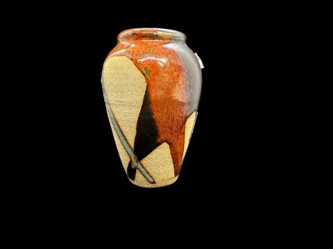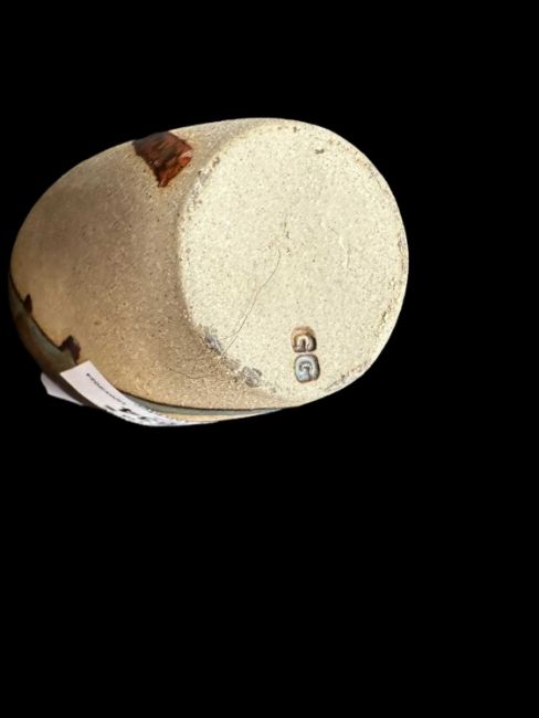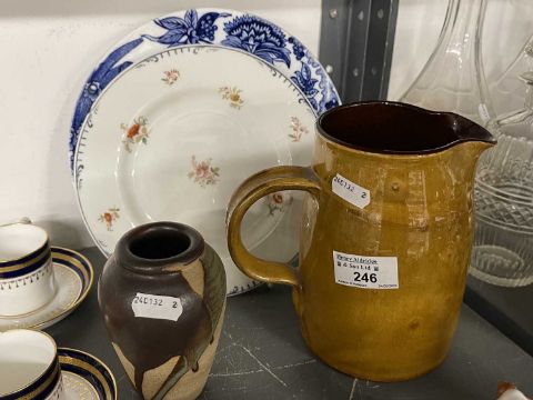 Studio pottery glazed harvest jug with potter's mark AC in a square plus a small stoneware vase with flow glaze potter's mark GG.