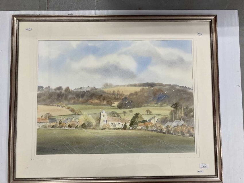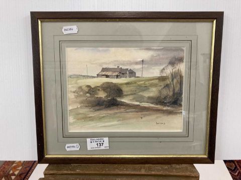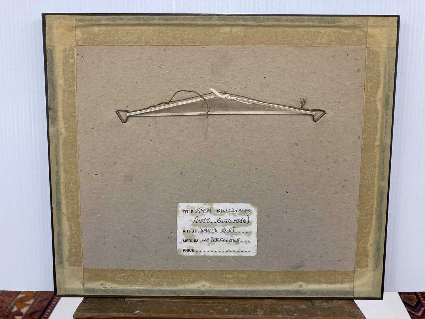 English School: David Rust (1963 - ) Watercolour 'The Farm Building'. Signed lower right, framed and glazed. Sight size 23cm. 17cm.