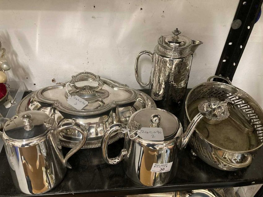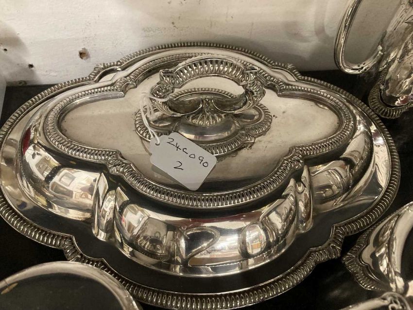 Teapot, coffee pot, hot water jug, oval ornate tureen, tea strainer and bowl, sugar nips, two salts and a serving dish (liner missing).