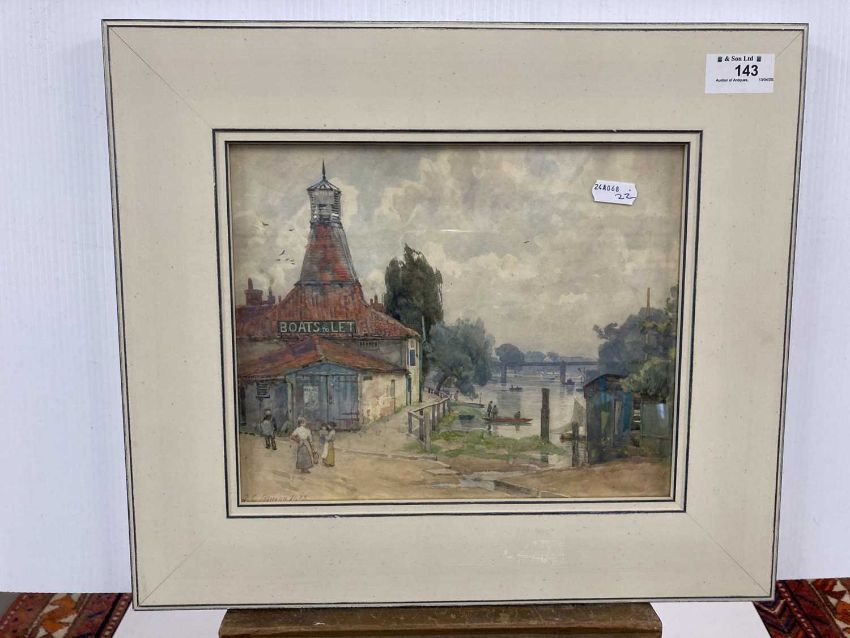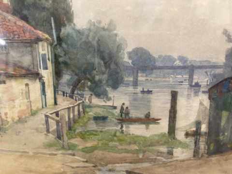 Watercolour 'Boathouse Beside The Thames', signed lower left. 22mm x 27mm.