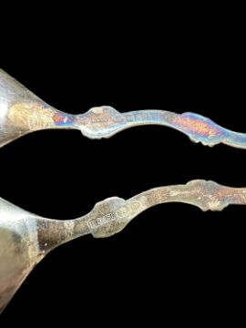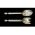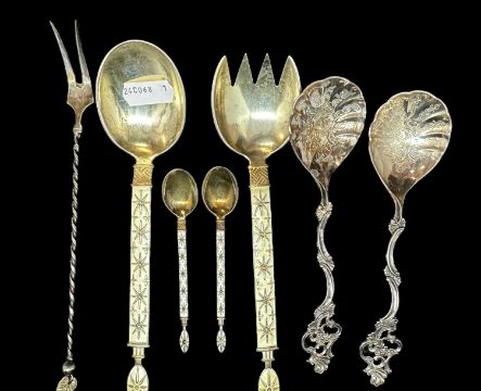 Norwegian silver gilt and enamel fork and spoon by J. Tostrup, together with a matching pair of coffee spoons, a pair of ornate silver spoons and a pickle fork, all pieces marked 830 and test as silver. Total weight 162g.