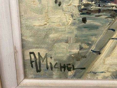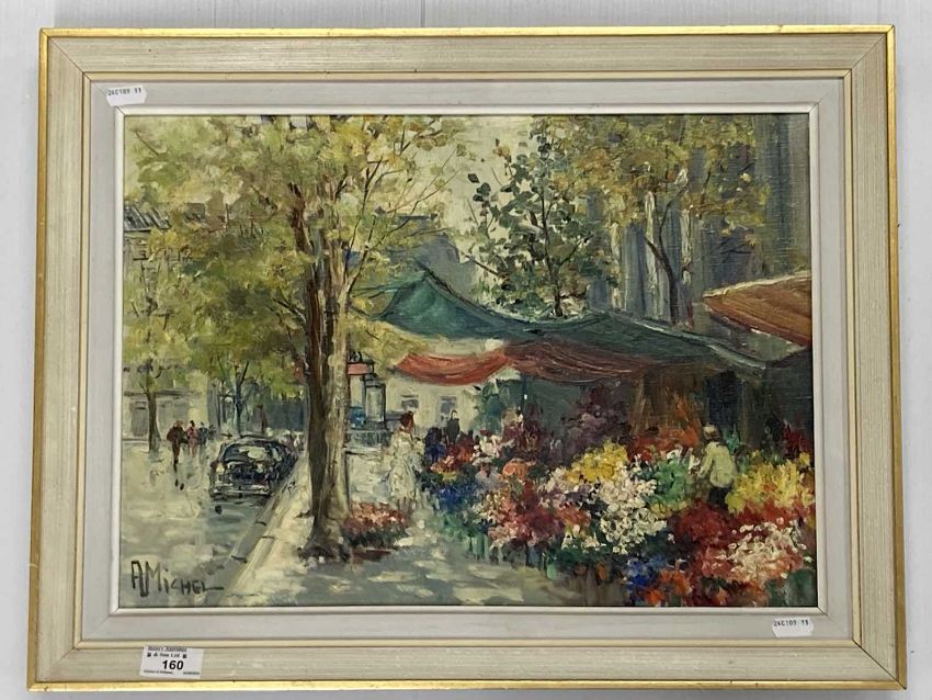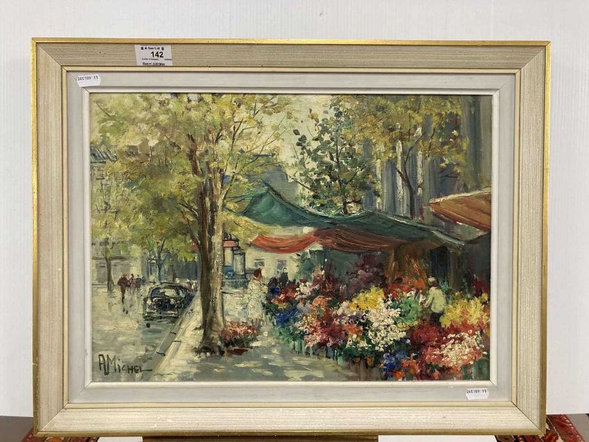 Oil on canvas, the flower market, Paris by Antoine Michel c1950, signed lower left. Sight size 45cm x 32cm