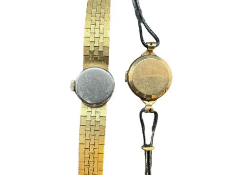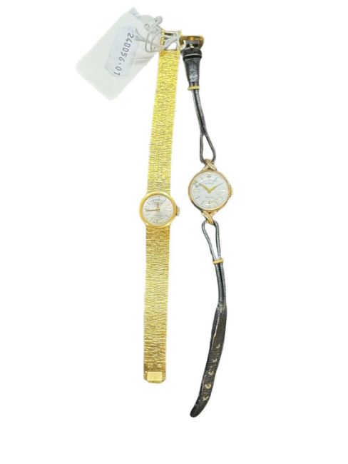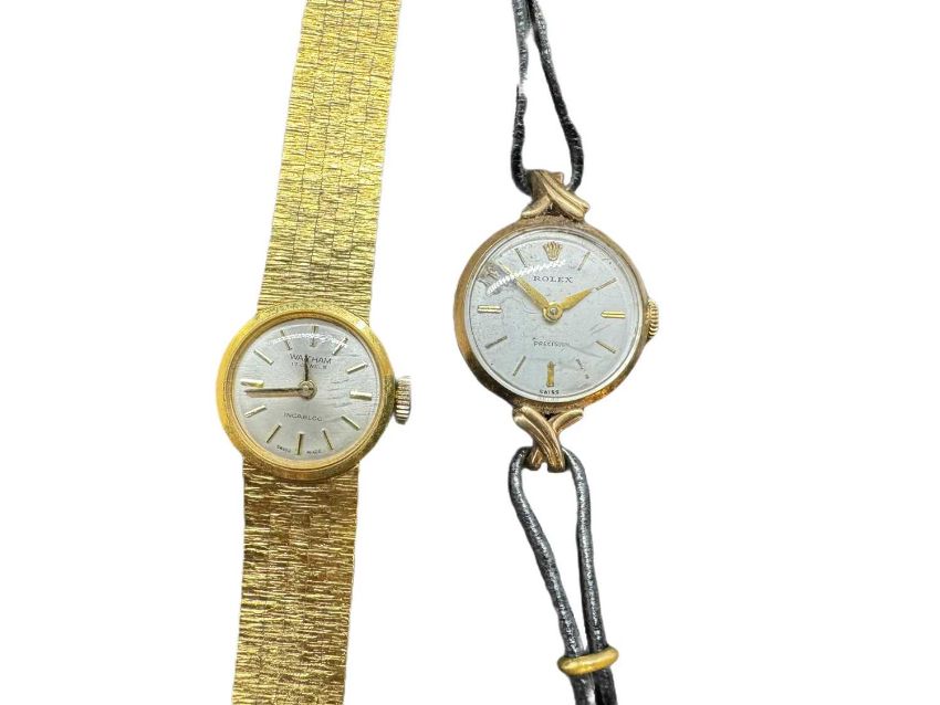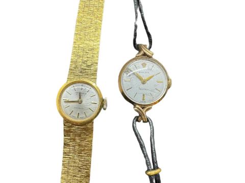 Watches: Ladies 9ct. gold cased Rolex, London 1961, on leather bootlace strap. Head 2.1cm. a cross including crown together with a gold plated ladies Waltham cocktail watch.