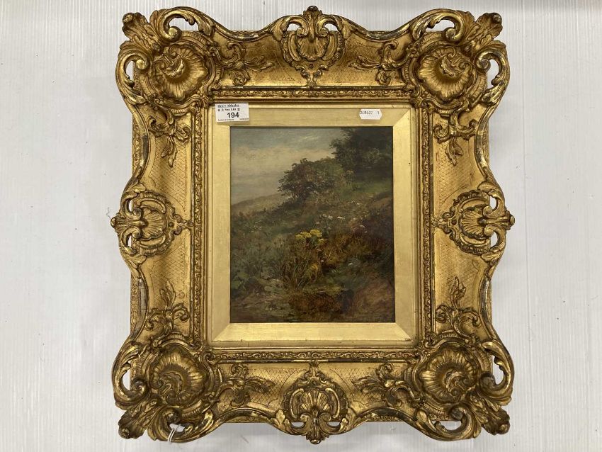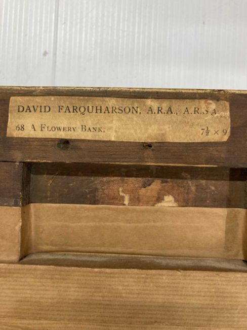 Paintings: David Farquharson ARA, ARSA, oil on board 'A Flowery Bank' signed lower left to middle. Label to verso. 7½ins. x 9ins. Mounted in an ornate gilt frame.