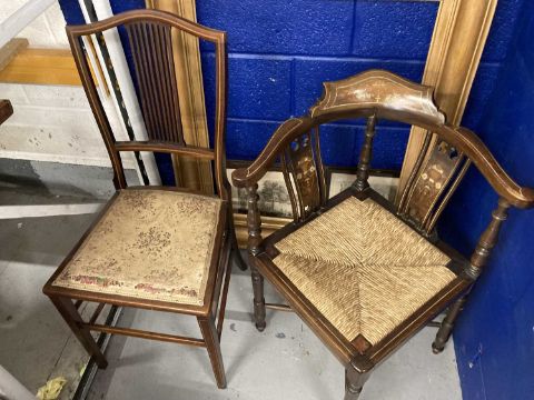 19th cent. Mahogany three inlaid bedroom chairs, an inlaid corner chair, a three-tier cake stand and a wine table. (6)