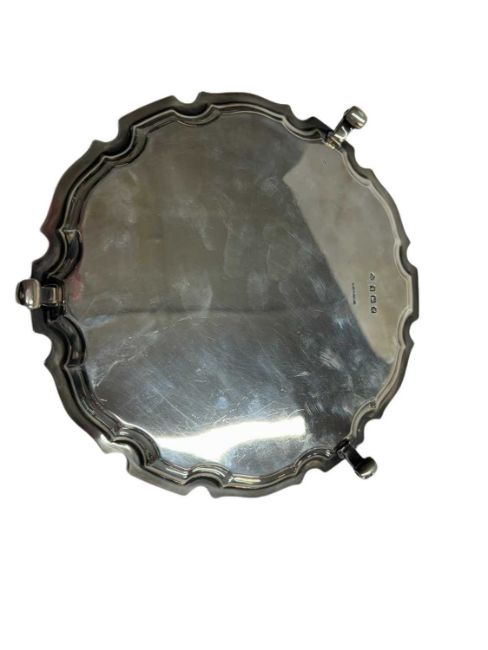 Hallamrked Silver: Card tray with pie crust edge. Birmingham 1946 by Adie Bros. Standing on three scroll feet, engraved with a central crest of a deer under a tree (worn). 20.5cm. 11.3 troy oz.