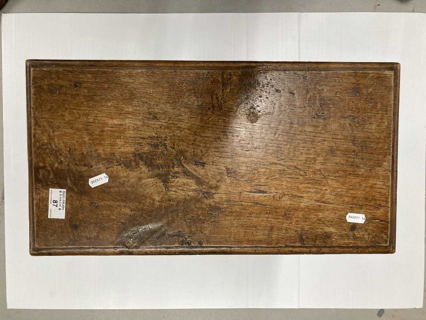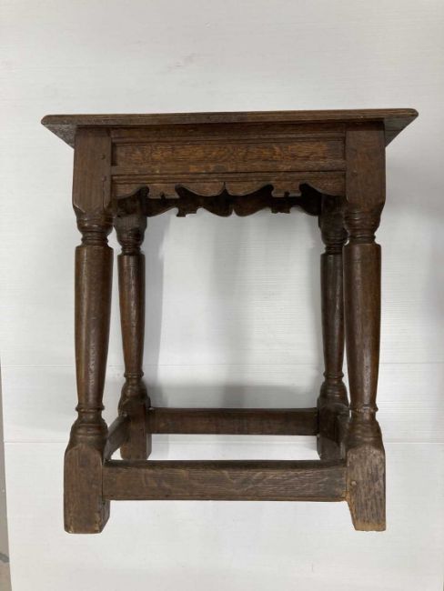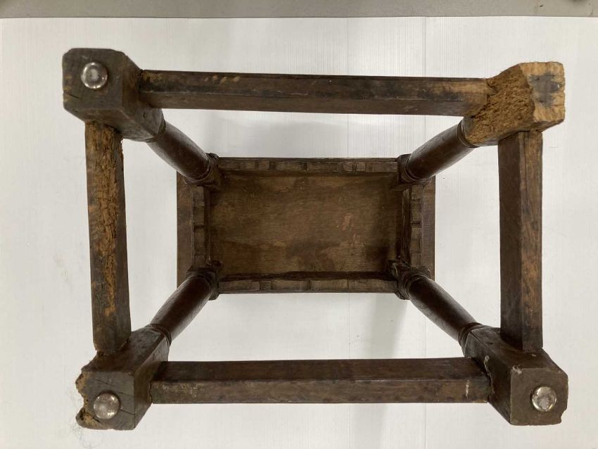 18th cent. Large oak peg jointed stool with carved decoration, turned supports. 50cm x 27cm x 56cm.