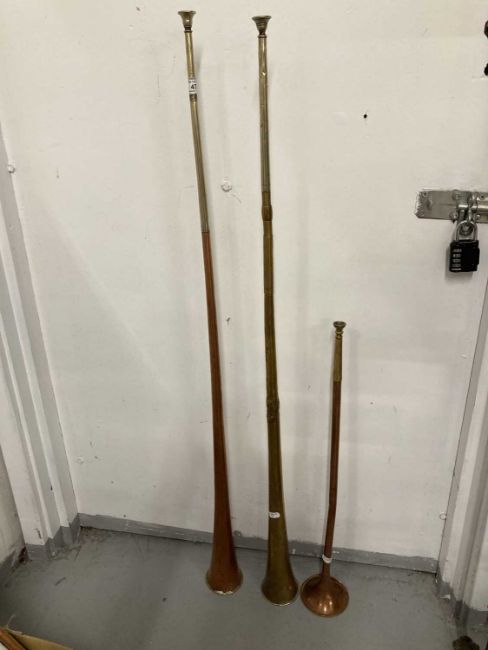 Metalware: 20th cent. Brass and copper coaching/post horns (3), the largest 41ins.