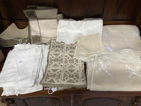 Linen: Quantity of matching table linen. Table cloths, napkins and buffet liners. Approx. 70 pieces.