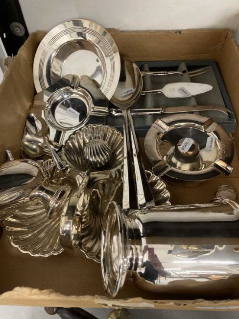 Silver Plate: Cocktail shaker, nut dish, ashtrays, spoons etc. to include a novelty shell tape measure.