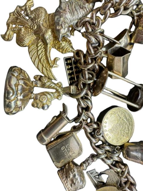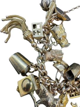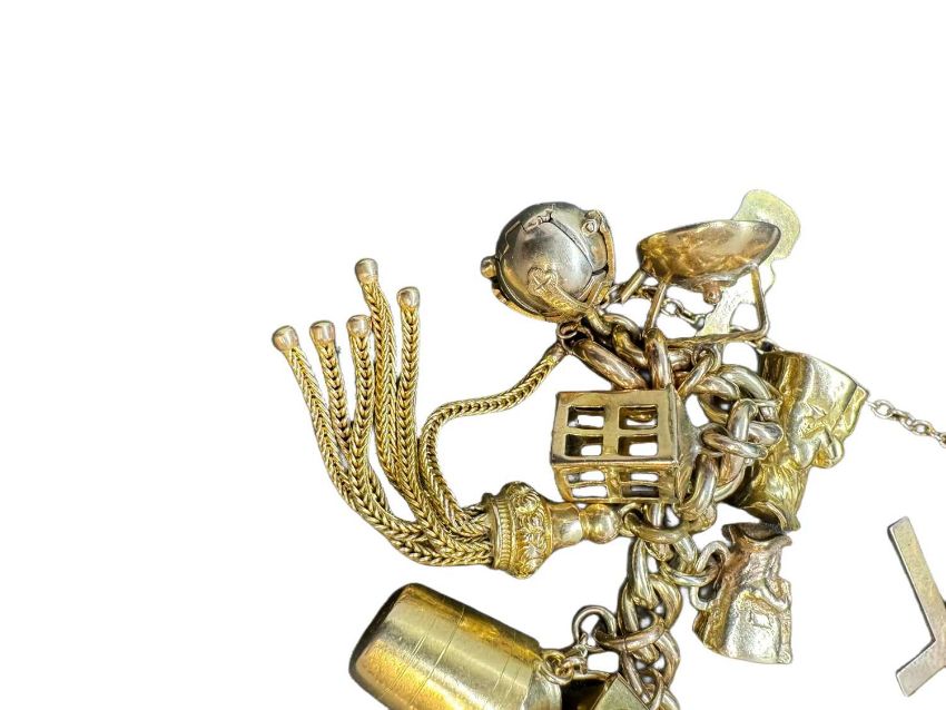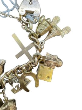 Jewellery: 9ct gold charm bracelet suspended with approx. 30 charms from around the world including an abacus, Toby jug, fob eal, etc. Primarily 9ct but also a Garuda charm testing as 18ct. Gross weight 66.8g.