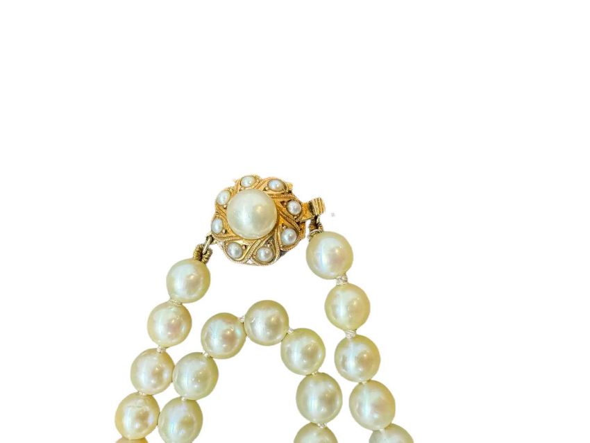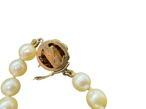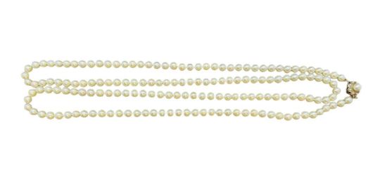 Opera-length cultured pearl necklace the yellow metal clasp marked k14 and tests as 14ct gold, 159 pearls each approx. 6.5mm. Overall length 120cm.