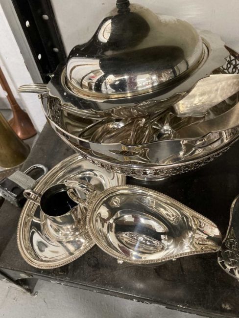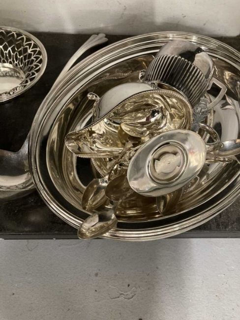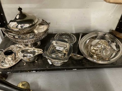 Pierced swing-handled basket, entree dish, muffin dish, sauce boat, cutlery and other silver-plated items.