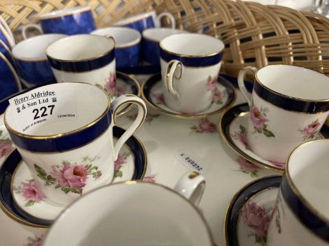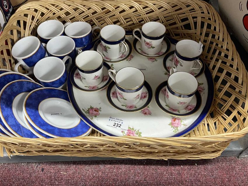 Complete coffee set of six cups and saucers on a foot plate base, rose decoration by BISTO, England c1930 (Bishop & Stonier), together with another coffee set (one cup missing).