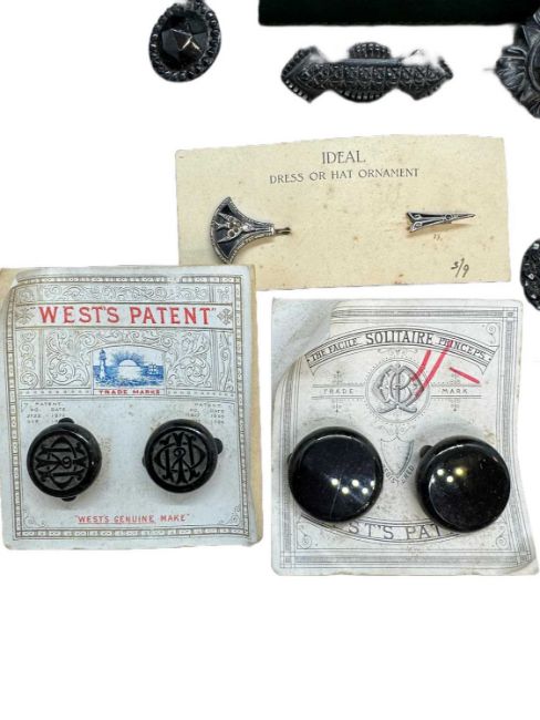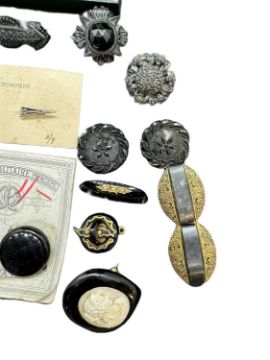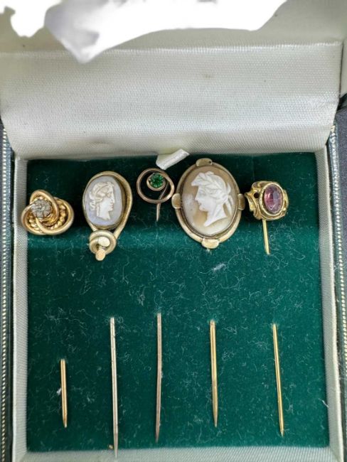 Collection of 16-piece Whitby jet jewellery, mens and ladies including cufflinks and brooches. Plus a collection of Victorian stick pins, cameos, amethyst, etc. 5 pins in total.