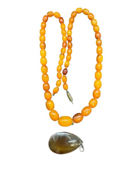 Jewellery: Butterscotch amber necklace with screw clasp and graduated beads, the largest 1.7cm, necklace 61cm, together with a polished agate teardrop pendant.