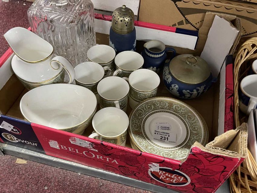 Decorative Arts: Royal Doulton English renaissance part coffee set, three pieces of Jasperware and a lead crystal decanter of square form .