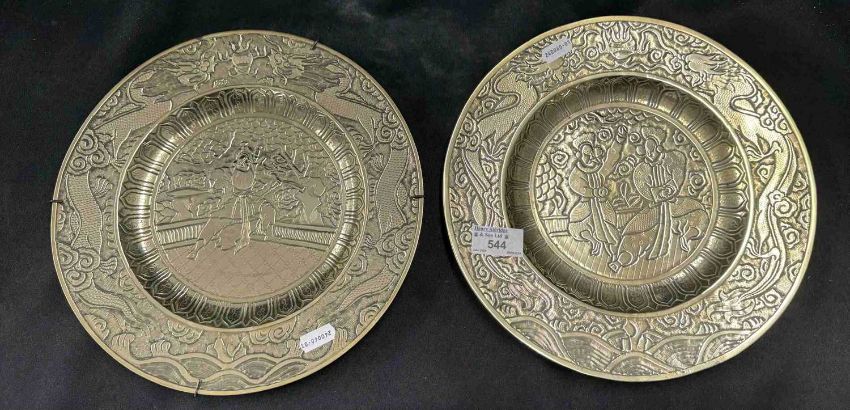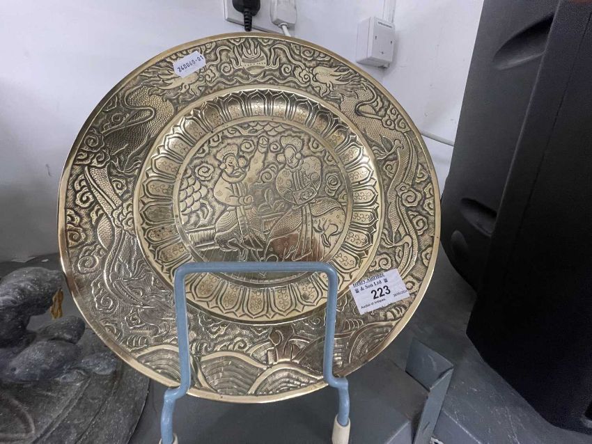 Oriental: Chinese polished brass on bronze plaque, centrally engraved with warriors, the border with dragons amongst clouds chasing a flaming pearl. The rear cast with a faux ming six-character mark surrounded by further dragons. 27cm. diameter.
