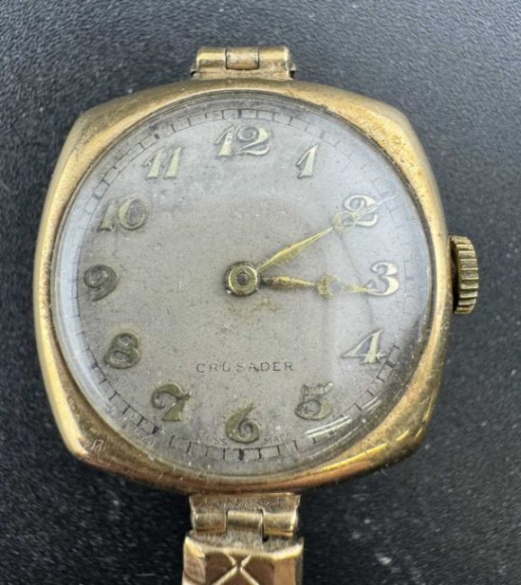 Watches: Mens 9ct. gold cushion cased wristwatch on expanding plated strap, head 2.5cm. across.