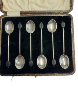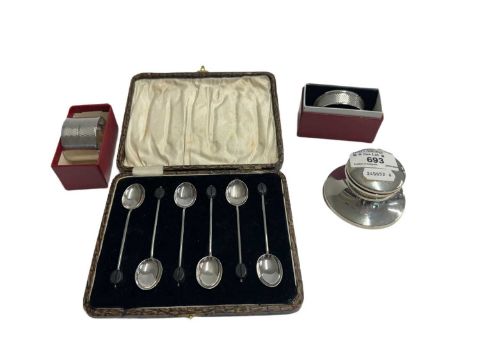 Hallmarked Silver: Caspian Inkwell, Birmingham 1984, boxed set of coffee bean spoons, Birmingham 1924, two silver napkin rings, one boxed. Weighable silver 2.3 troy oz.