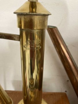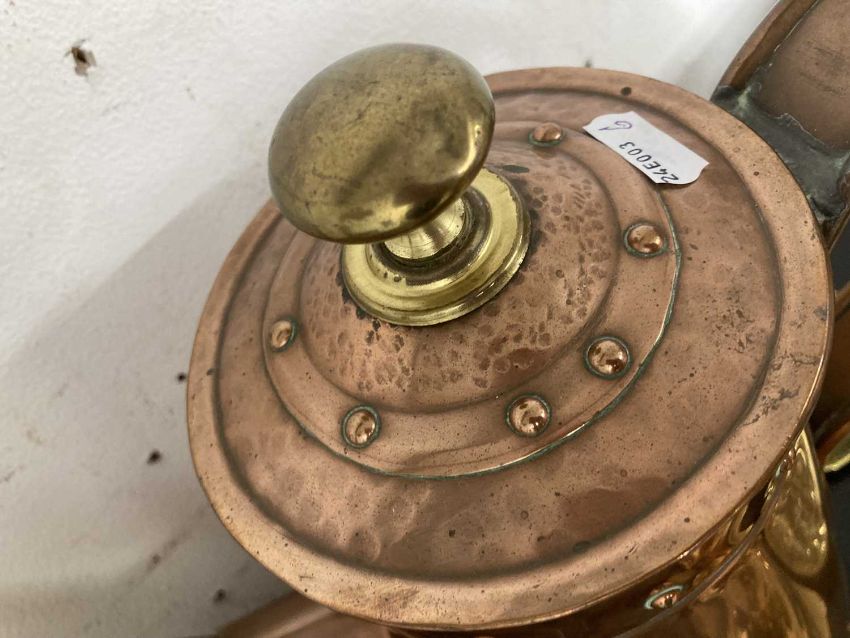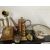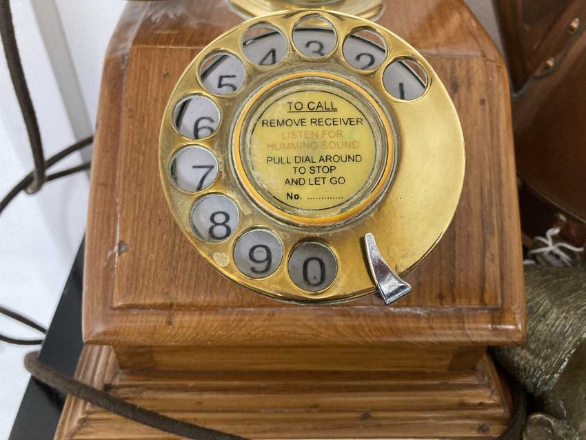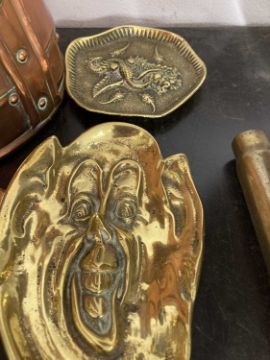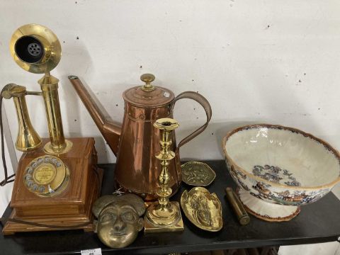 Metalware: Reproduction brass stick telephone wired for today's systems, large Art-style copper kettle/watering can, brass candlestick, 20mm shell case, standard lamp, three brass ornaments and an Oriental decorated fruit bowl, 10½ins. dia.