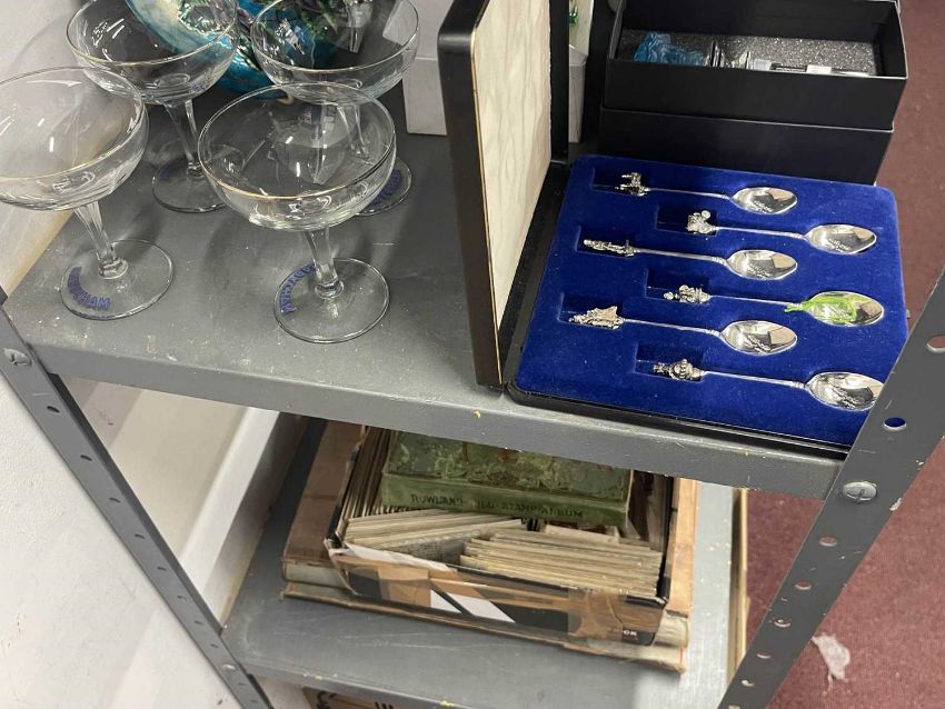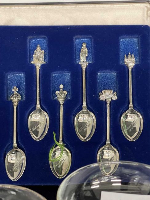 EPNS plated 'Silver Jubilee' 1952-1977 teaspoons with Heraldic finials x 6 together with four vintage Babycham glasses c1950s all in excellent condition with no losses, bright glass.