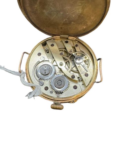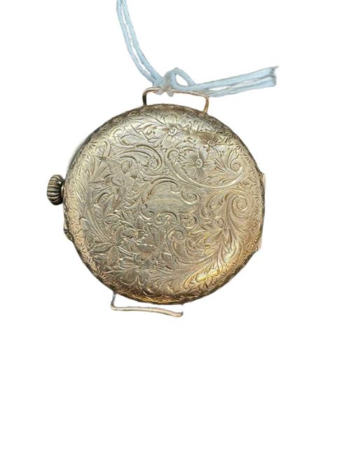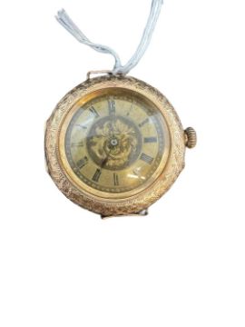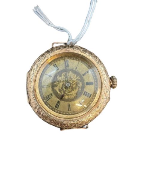 Watches: Early 20th cent. 14ct gold ladies wristwatch, floral engraved dial with Roman numerals, 3.3cm diameter including crown. Gross weight 3.7g.