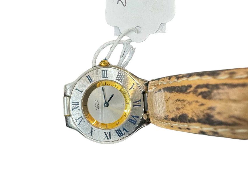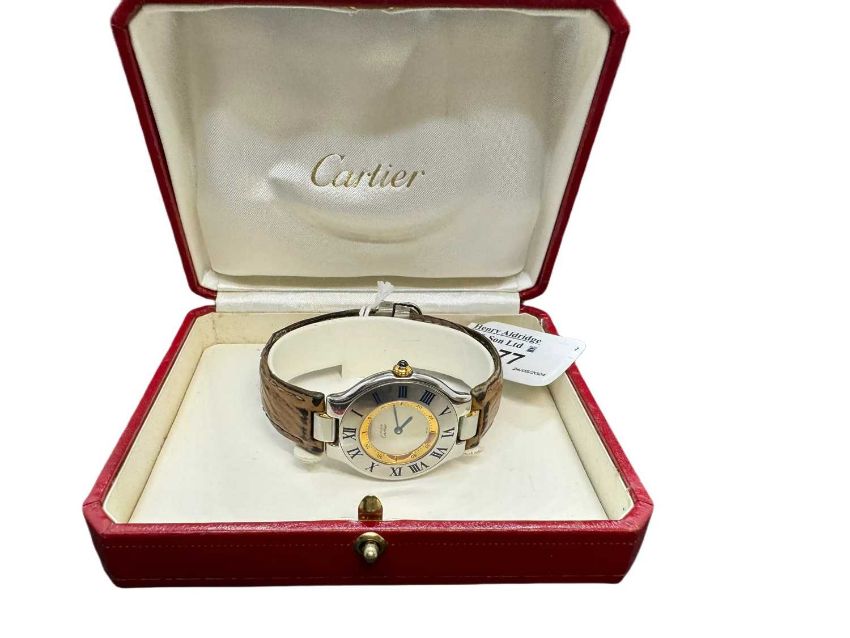 Watches: Cartier 21 stainless steel and 18ct gold intermediate size having Roman numerals on a leather strap with a deployment clasp, serial number 1330PL80310, with box, no paperwork.
