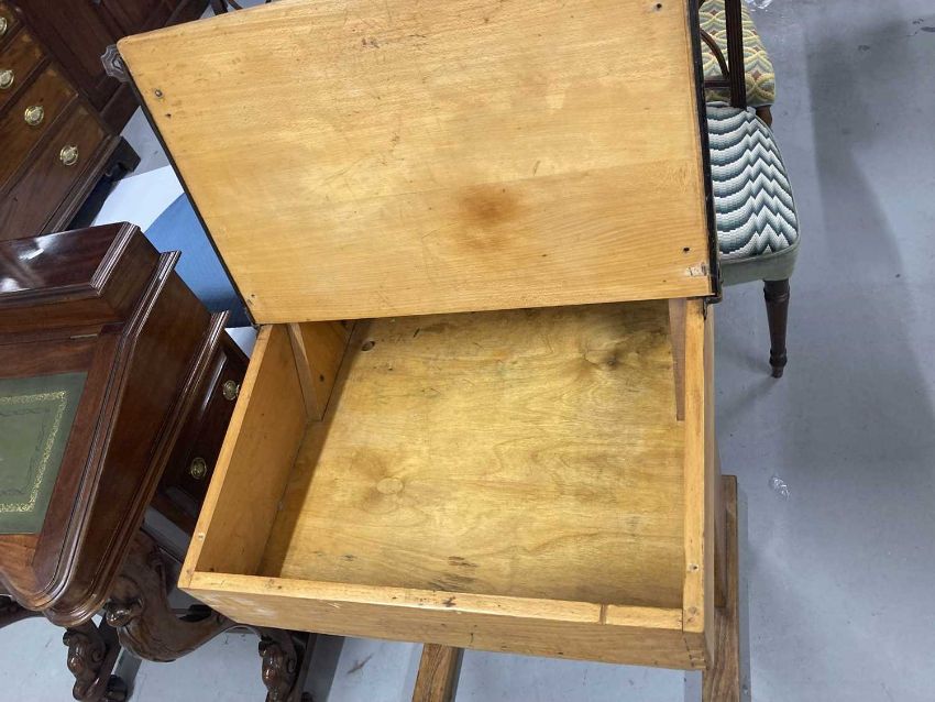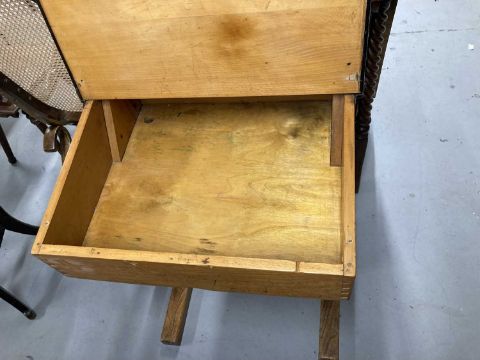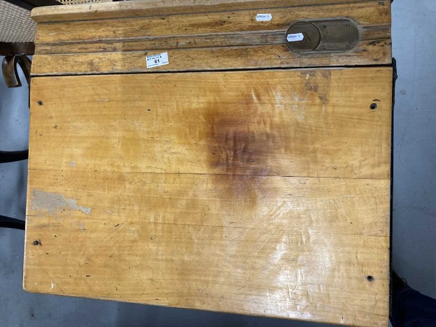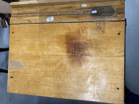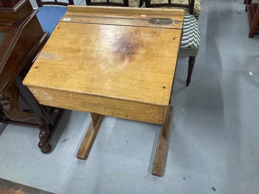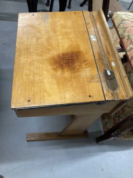 Mid 20th cent. Oak school desk with lift-up lid, pen groove, brass inkwell and sliding cover.