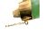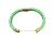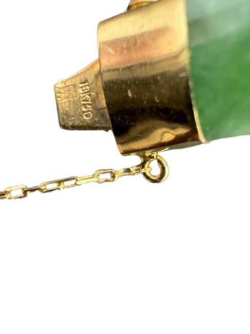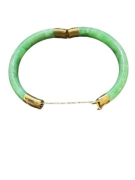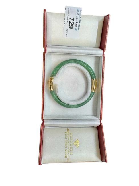 Chinese hinged bangle in mottled green jadeite the mounts in yellow metal marked 750 tests as 18ct gold in original Hong Kong retailer's box.