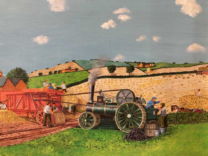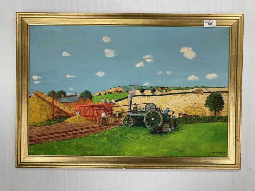 Paintings: A W Chesher 1897 - 1972 Exhibited Jefferess Gallery London. Oil on Board 'traction Engine and Clayton Hay Maker at work' 25" x 14¾" signed lower right.