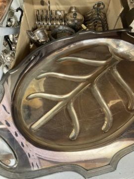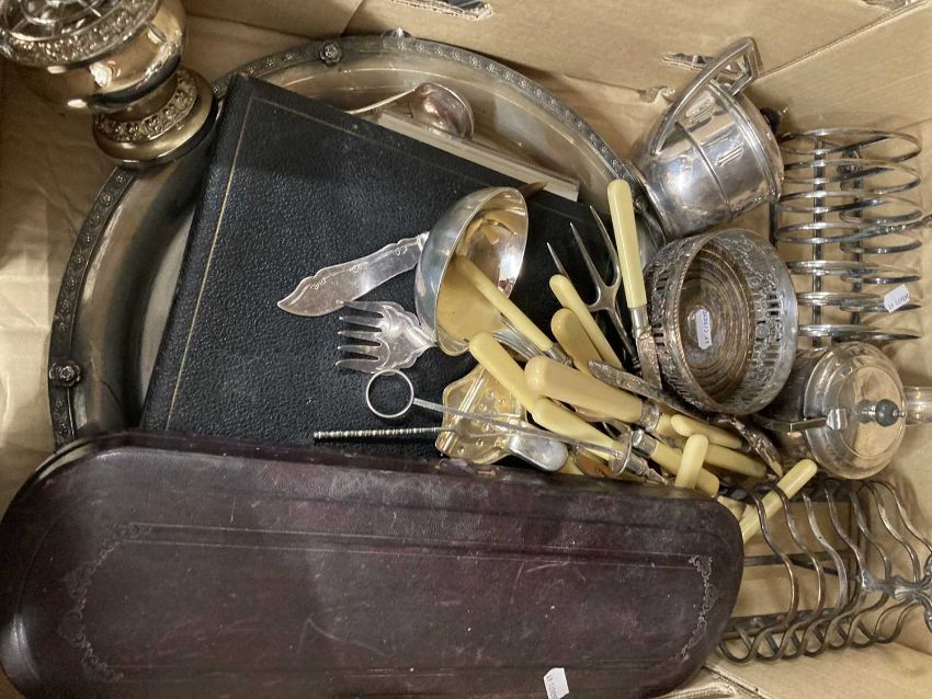 Silver Plate: Turkey drainer plate, part teaset, toast racks and other silver plate and metal items.