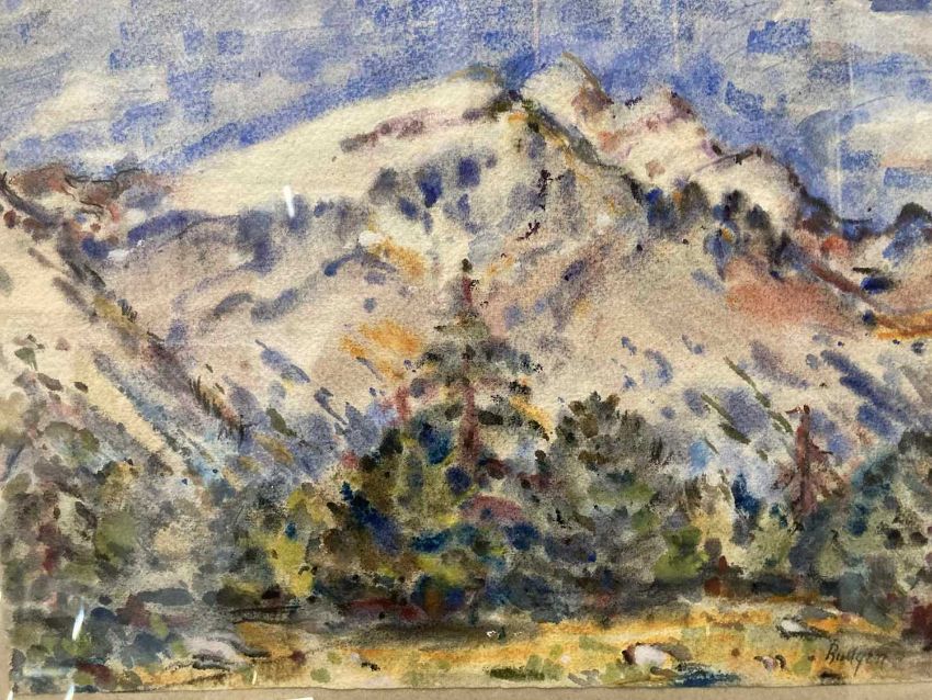 ‘The Swiss Alps’ signed watercolour c1914-1916 in original oak frame under glass with paper margin in good untouched condition with no losses, signed lower right. Image size 15ins. x 10½ins. Overall size 19½ins. x 15¾ins.