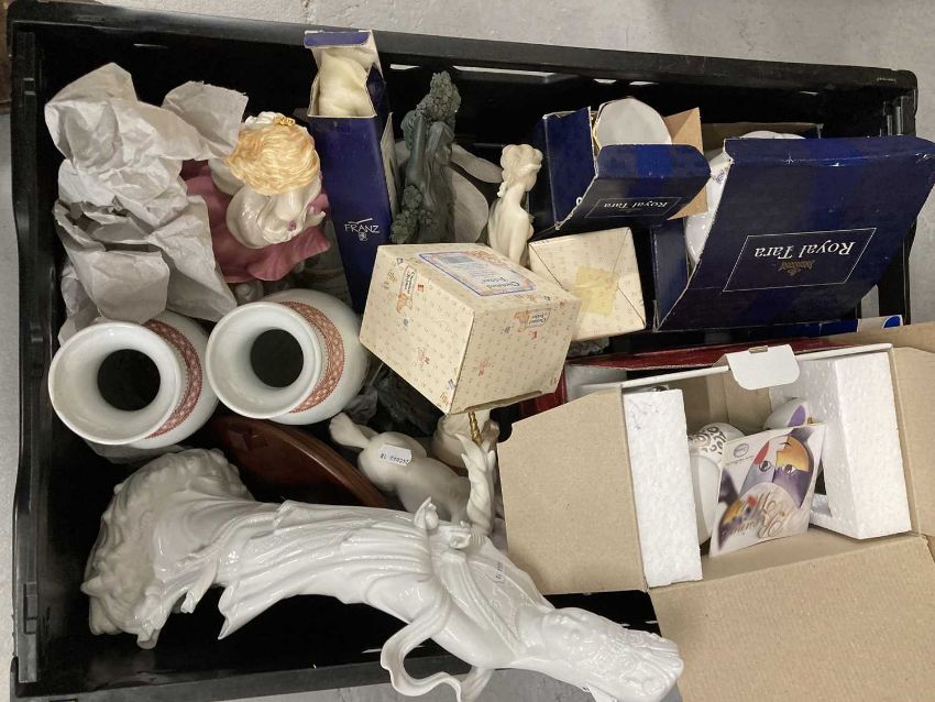 Goebel Rosina's World figures boxed, Tara Potts Unicorn, Baby Elephant, Giraffe, Chinese Goddess of Heaven, Teddy Bear x 3, Cinderella, treen mantel clock, etc.
