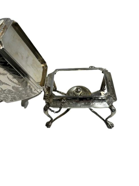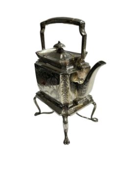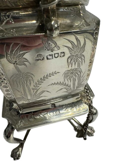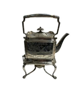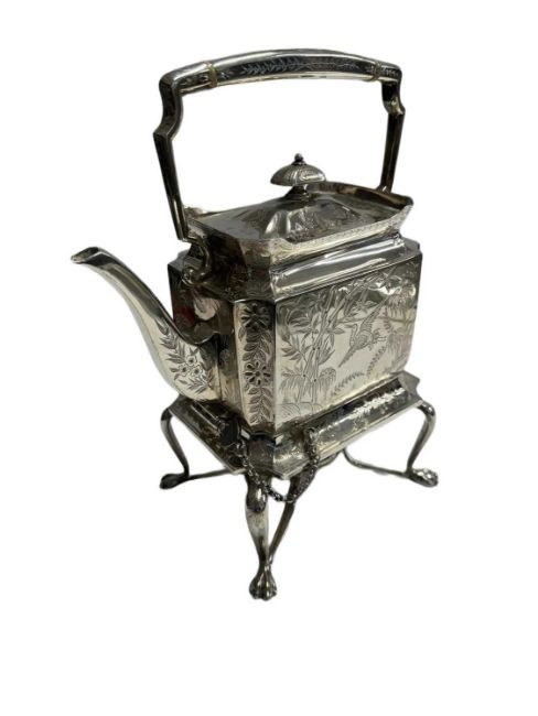 Aesthetic-style spirit kettle on stand engraved in the Japanese style with cranes in flight amongst bamboo and chrysanthemums, Monoah Rhodes, London 1898, with ivory insulators to handle. Gross weight 43.9ozt.Ivory submission reference DGR7BTV1