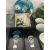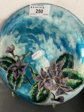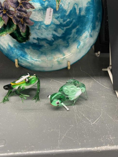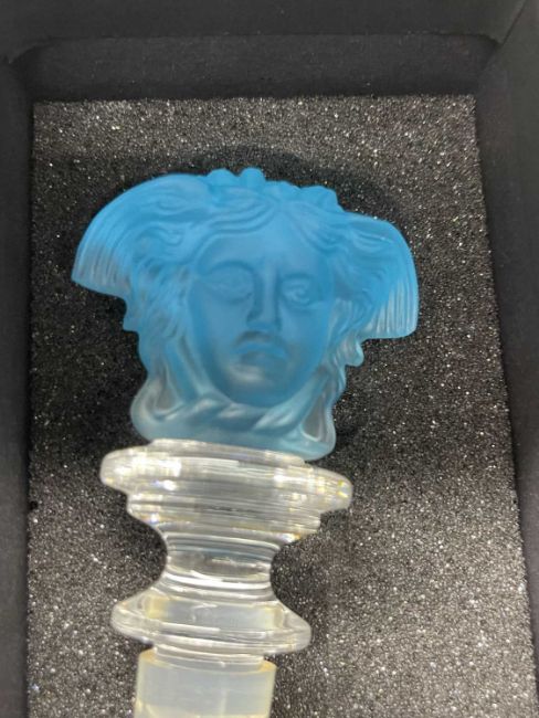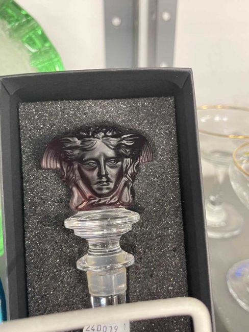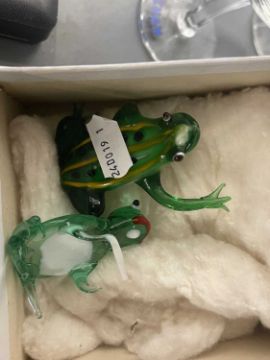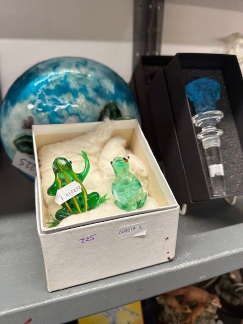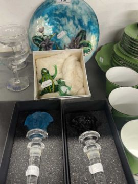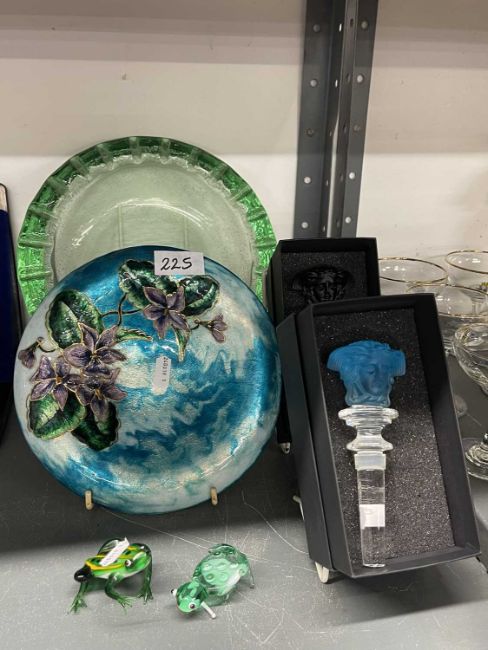 The Weill Collection. Wine bottle stoppers by Rosenthal in the Medusa Lumiere pattern, light blue and deep purple masks both boxed, a Limoges glass bowl and two green glass frogs.
