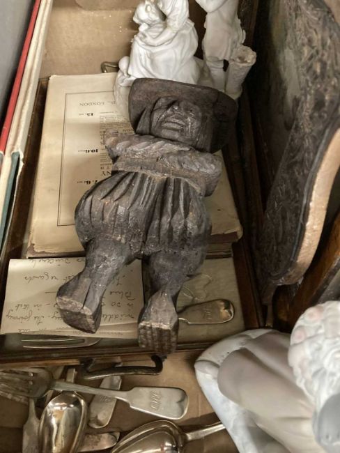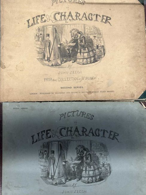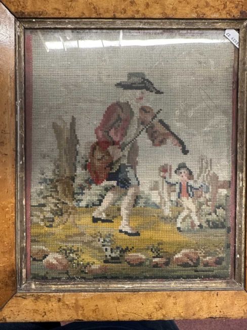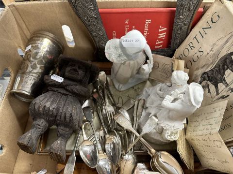 White metal Art Nouveau picture frame, needlework tray, woolwork of a fiddler, carved wooden figure, book pictures of Life and Character John Leech, 2nd series - Bradbury & Evans 'They're Away', Beatrice Holden, Lionel Edwards 1945 1st Edition.