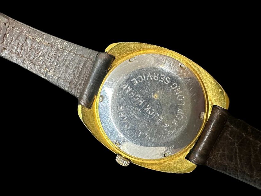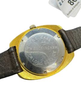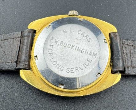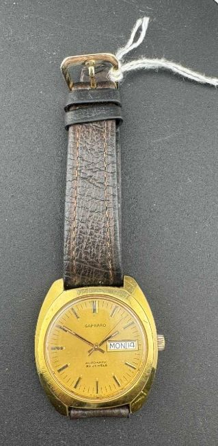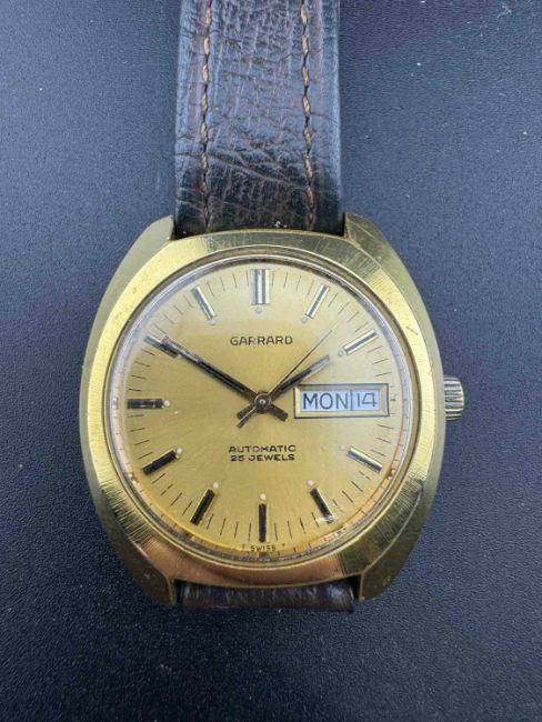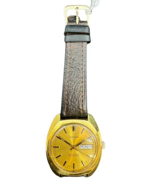 1970s/80 Garrard automatic watch, gold tone case and face on brown leather strap.