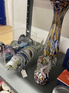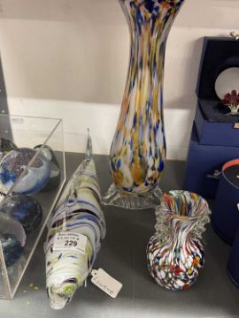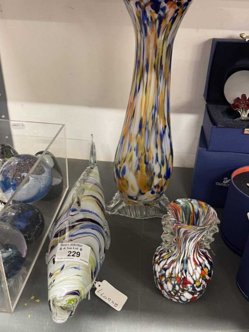 Glass: 20th cent. Italian art glass Murano, multicolour vase, height 4¾ins, elongated vase height 14ins and decorative fish length 15ins.