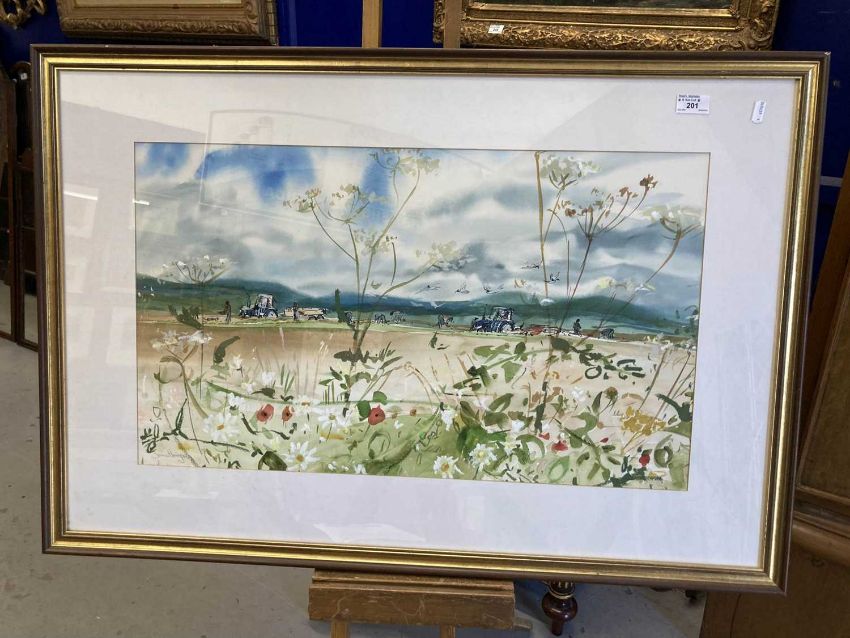 Paintings: James Harrigan 1937 - Watercolour 'Harvesting the Fields'. Signed lower left, 28½ins. x 17ins. Framed and glazed. Harrigan studied at the Glasgow School of Art between 1956 -1961 he has exhibited widely including the House of Lords and was winner of The Laing Landscape Competition.