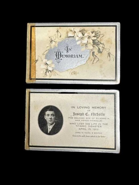 Rare memorial card to Second-Class passenger Joseph C. Nicholls aged 19 with black memorial/mourning band to edge. 4½ins. x 3ins.