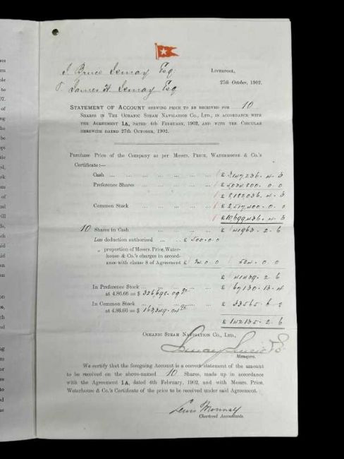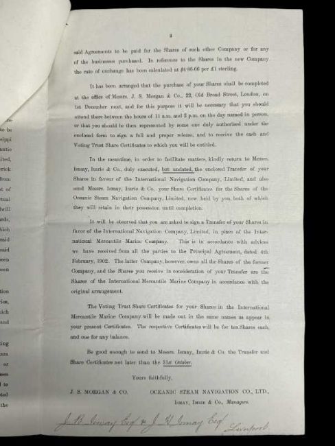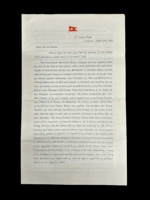 SALE OF THE WHITE STAR LINE TO J.P. MORGAN ORIGINAL PAPERWORKDated 27th October 1902, this incredible document is the original ‘Formal Notice’ given for the purchase of the White Star Line on 1st December 1902 by J.P. Morgan's, International Mercantile Marine Co. (IMMC) for the staggering sum of $120 million in fully paid shares; the equivalent of $3.8 billion today. The five Voting Trustees were none other than: J.P. Morgan, William Pirrie, J. Bruce Ismay, A.B. Widener and Charles Steele; both on the Board of Directors of the IMMC.Documented are the purchases of the Mississippi and Dominion Steam Ship Co, British and North Atlantic Steam Navigation Co, Atlantic Transport Co. and the Leyland Line; all recently added to the IMMC by Morgan, but the White Star Line was the ‘Jewel in the Crown’ he had sought after for many years. Also mentioned is ‘Provision has been made for new tonnage and the working capital there in specified has also been arranged for.’ Such capital no doubt assisted with the building of the last two of the ‘Big Four’; R.M.S. Baltic and Adriatic and later, R.M.S. Olympic and Titanic. Attached is the ‘Statement of Account’ for 10 shares in the Oceanic Steam Navigation Co. (OSNC) made up of cash and Common Stock and Preference Shares paid to J. Bruce Ismay and his brother, James Hainsworth Ismay totalling £10,700,000 (almost £1.6 billion today). Signed by J. Bruce Ismay on behalf of Ismay, Imrie & Co, the figures were hand-written and prepared by Ismay’s secretary, Willaim Henry Harrison, who would be lost in the sinking of R.M.S. Titanic, less than ten years later. His body was recovered by the cable ship, MacKay-Bennett (body #110) and is interred at Fairview Lawn Cemetery in Halifax, Nova Scotia.A truly unique and incredible museum grade piece of ephemera from one of the most significant moments in maritime history.