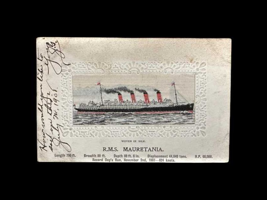 Unusual on board silk postcard, postally used Queenstown 1908.