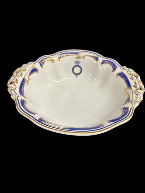 Copeland blue and gold pattern open comport/tureen, garter crest to centre bearing the title 'The Royal Yacht' from H.M.Y. Victoria and Albert, makers mark to underside. Width 12ins. Height 4ins.