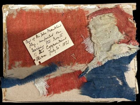 An extremely rare, frayed section of Sir John Franklin’s Union Jack Flag with period note stating this was part of the flag unfurled upon reaching the mouth of the Coppermine River on July 20th 1821.Sir John Franklin KCH FRS FLS FRGS (16 April 1786 – 11 June 1847) was a British Royal Navy officer and Arctic explorer. After serving in wars against Napoleonic France and the United States, he led two expeditions into the Canadian Arctic and through the islands of the Arctic Archipelago, in 1819 and 1825, and served as Lieutenant-Governor of Van Diemen's Land from 1839 to 1843. During his third and final expedition, an attempt to traverse the Northwest Passage in 1845, He commanded H.M.S. Erebus and H.M.S. Terror and was assigned to traverse the last unnavigated sections of the Northwest Passage in the Canadian Arctic and to record magnetic data to help determine whether a better understanding could aid navigation, known as Franklin's Lost Expedition the ships became icebound off King William Island in what is now Nunavut, where he died in June 1847. They were abandoned ten months later and the entire crew died, from causes such as starvation, hypothermia, and scurvy.Twenty-eight years prior to the Lost Expedition Franklin led, the Coppermine Expedition of 1819–1822, which was an overland undertaking to survey and chart the area from Hudson Bay to the north coast of Canada, eastwards from the mouth of the Coppermine River. The expedition was organised by the Royal Navy as part of its attempt to discover and map the Northwest Passage. It was the first of three Arctic expeditions to be led by John Franklin and also included George Back and John Richardson, both of whom would become notable Arctic explorers in their own right. The expedition was plagued by poor planning, bad luck and unreliable allies. The local fur trading companies and native peoples offered less assistance than expected, and the dysfunctional supply line, coupled with unusually harsh weather and the resulting absence of game, meant the explorers were never far from starvation. Eventually, the party reached the Arctic coast but only explored roughly 500 miles (800 km) before turning back due to the onset of winter and the exhaustion of their supplies. The party desperately retreated across uncharted territory in a state of starvation, often with nothing more than lichen to eat; 11 of the 22 members died amid accusations of murder and cannibalism. The survivors were rescued by members of the Yellowknives Nation, who had previously given them up for dead.10ins. x 7ins. Provenance via direct descent from Rev. Frank Alston who was married to Mary Wright, Sir John’s niece.