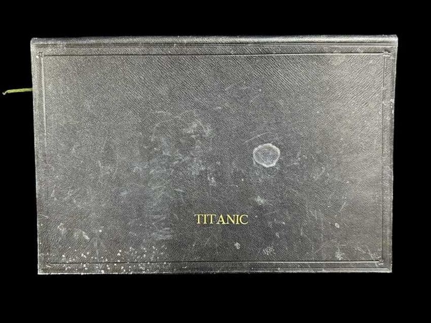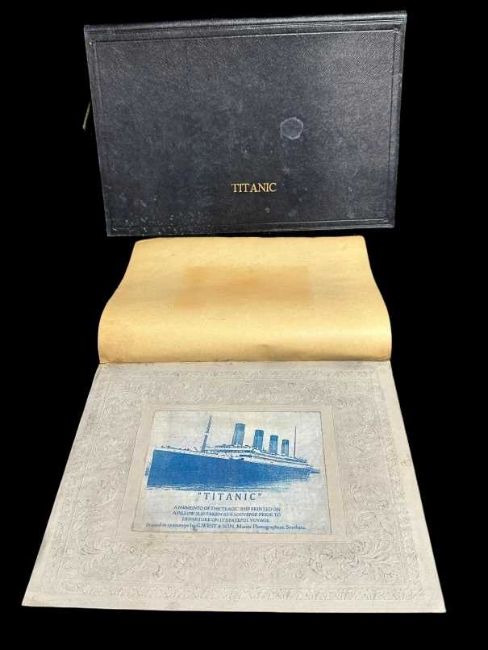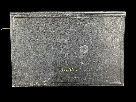 Extremely rare Period cyanotype of Titanic with the legend 'A Momento of the Tragic Ship printed on a pillow slip taken as a souvenir prior to departure on her maiden voyage.' Sold together with the leather blotter that accompanied it, 9ins. x 11ins. With border and blotter, 14ins. x 9ins. Included with the lot is a reprint from The Morning Leader showing the Great White Star Liner Titanic.