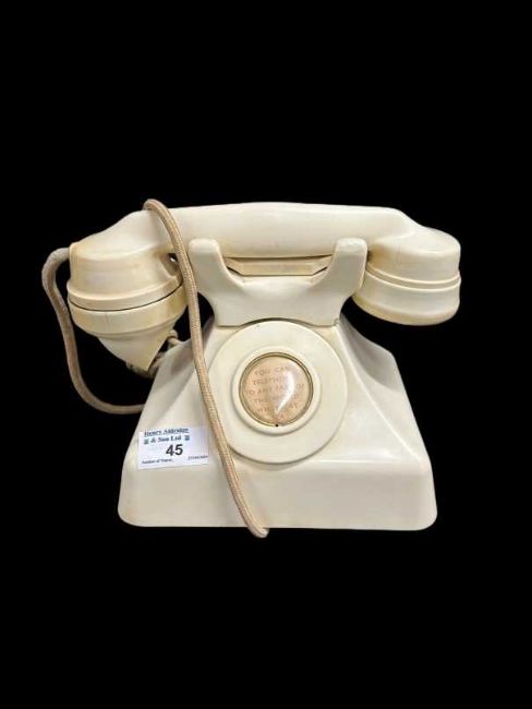 First-Class Stateroom cabin telephone made from Roinade Bakelite circa 1936, dial bears inscription 'You may telephone to anywhere in the world whilst at sea', losses and age-related cracks. A/F.