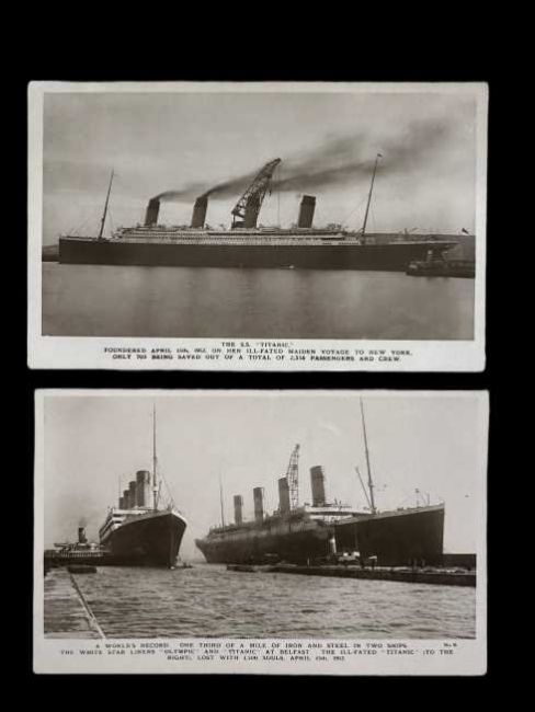 Rare real photo postcards of Titanic in Belfast 'A World Record One Third of a Mile of Iron and Steel in Two Ships' by Walton of Belfast. Plus Titanic being fitted out, by Hurst and Co.